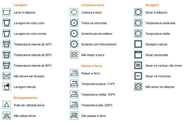 O código de cuidados para manutenção de artigos têxteis é constituido por cinco tipos de símbolos básicos.